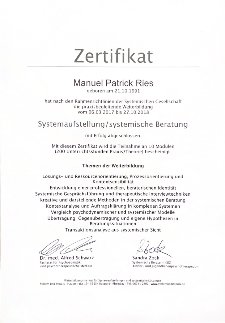 Seit vielen Jahren arbeite ich mit systemischen Methoden, Aufstellungen und phänomenologischen Zugängen in Gruppen, Organisationen und Einzelsettings. Meine Haltung orientiert sich an der modernen systemischen Schule (u. a. Gunthard Weber) und ist klar abgegrenzt von historischen Formen, die nicht mehr den heutigen Standards entsprechen.